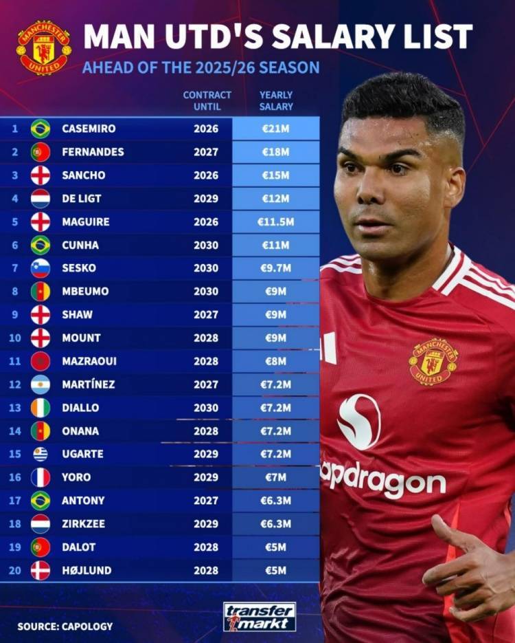 德转列曼联球员年薪:卡塞米罗2100万欧居首,桑乔1500万欧第三
